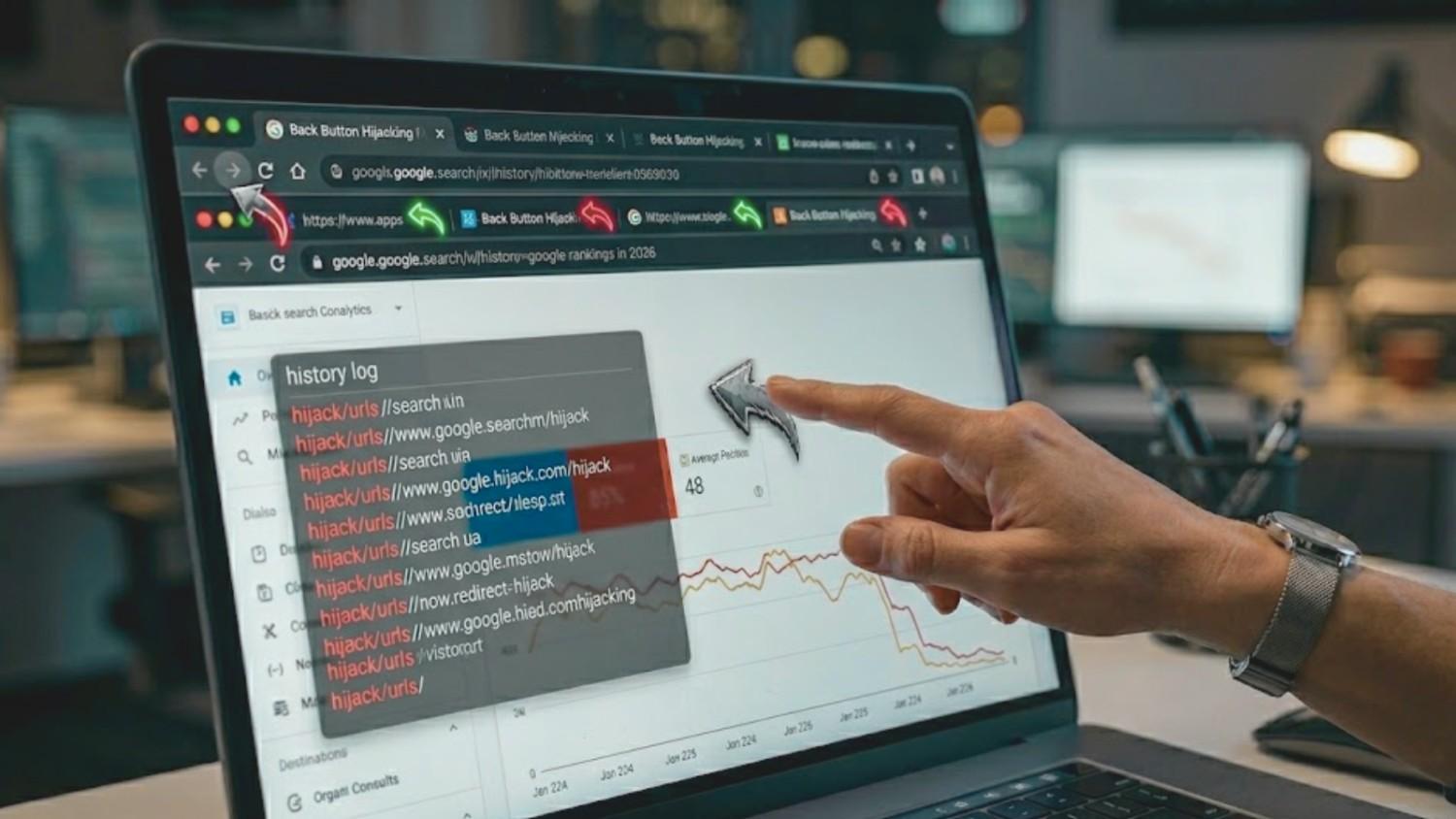 Back button hijacking happens when a site interferes with a user’s browser controls to prevent them from returning to the previous page. A user clicks “back” expecting to land on the search result they came from. The site intercepts that click and sends them somewhere else.